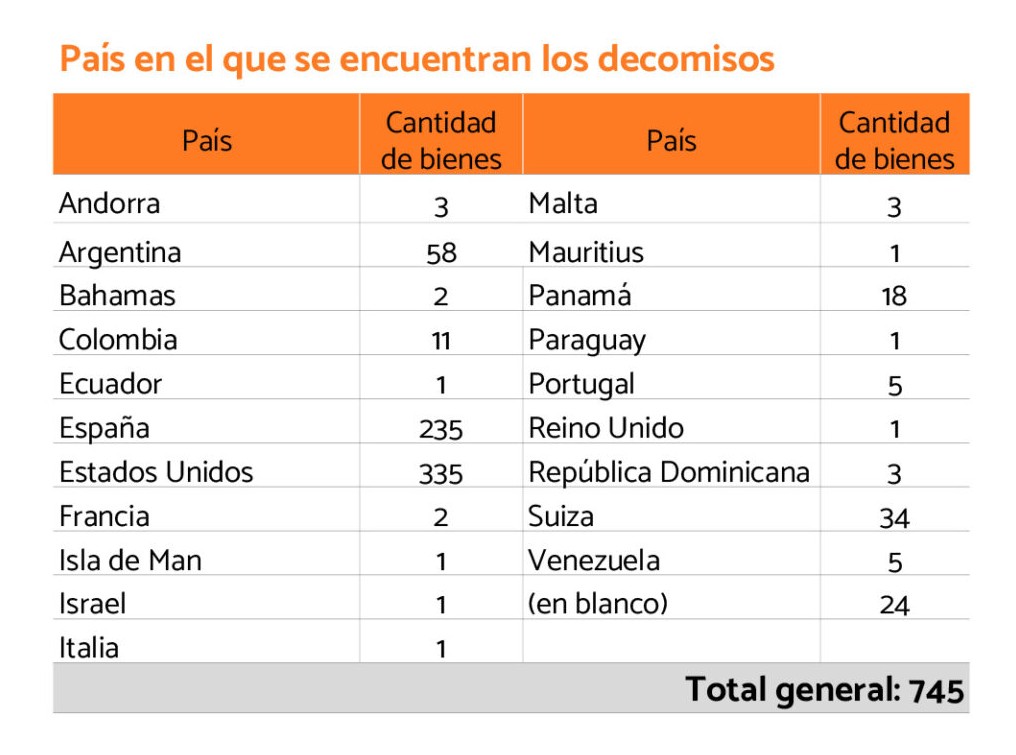 A Estados Unidos lo siguen en incautación España, con 235 bienes y Argentina con 58. Otras naciones en las que se registran más bienes decomisados que se presume son productos de la corrupción originada en nuestro país son Suiza (34), Panamá (18) y Colombia (11).