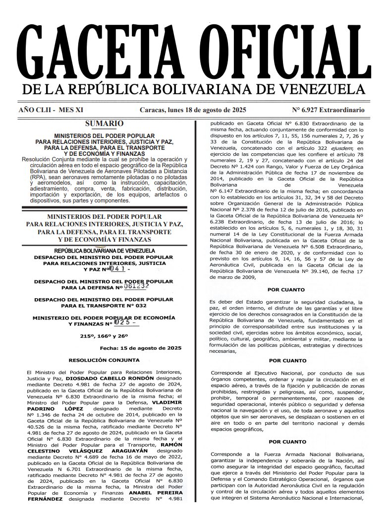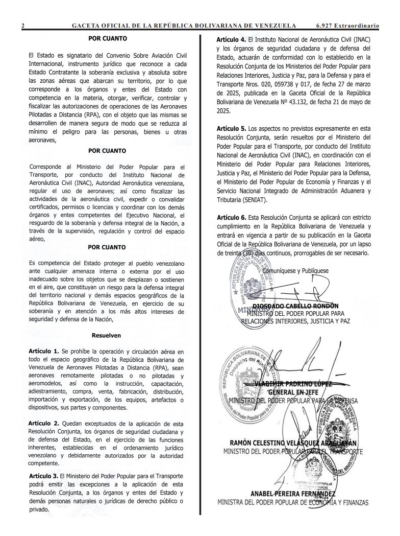 Ramón Celestino Velásquez Araguayán informó este martes en redes sociales sobre la publicación de la Gaceta Oficial Extraordinaria N° 6.927 que ordenó la restricción del vuelo de drones en Venezuela, así como su compra, venta, distribución o importación de partes o equipos afines.