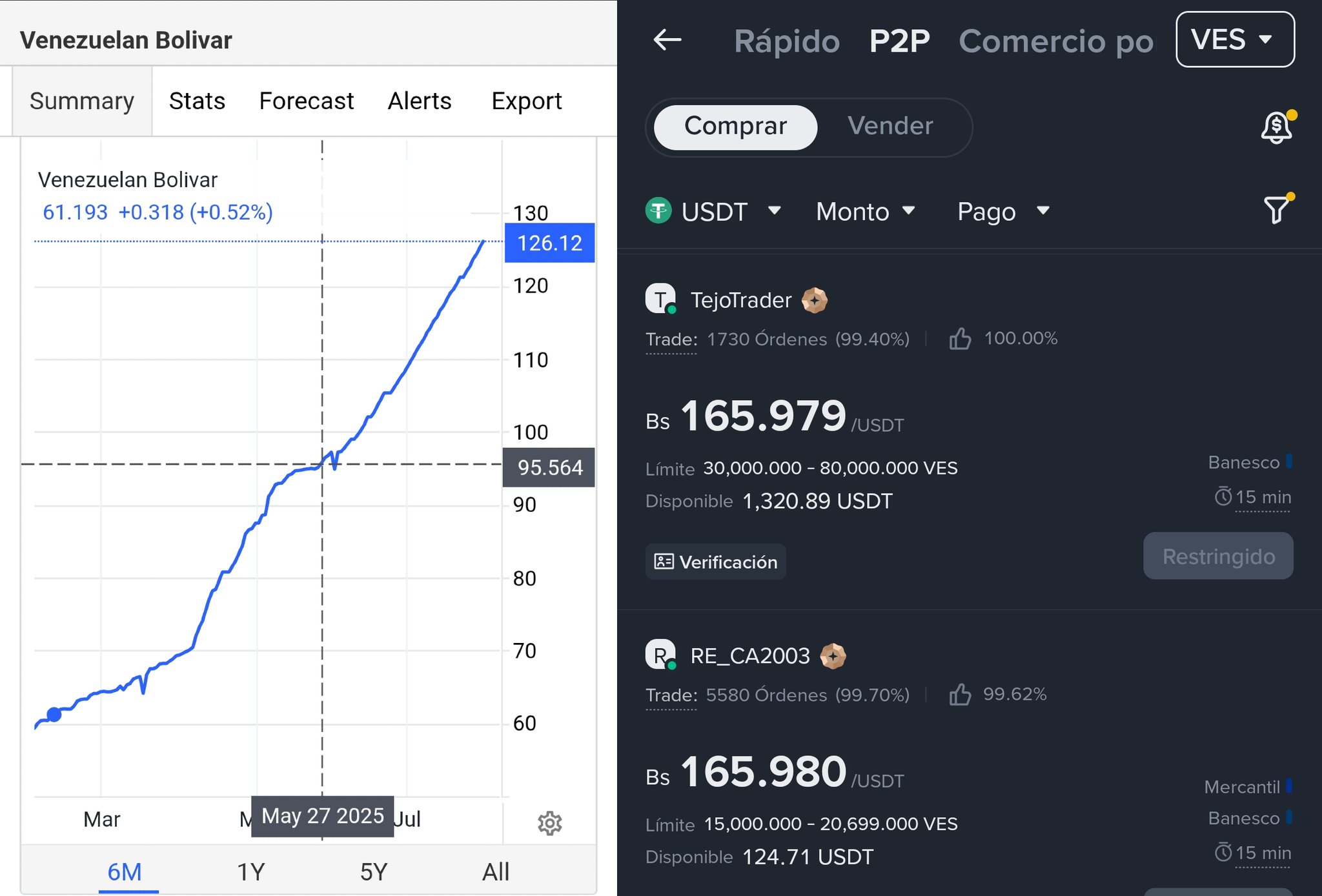 El analista económico Hever Castro lo dejó claro este 3 de agosto con un gráfico compartido en su cuenta de X: el 27 de mayo, cuando el gobierno mandó a bajar la santamaría de la conocida página de referencia, la tasa oficial del BCV estaba en 95Bs y la paralela en 133Bs. Hoy, ambas están mucho más arriba: 126Bs la oficial y 166Bs la paralela.