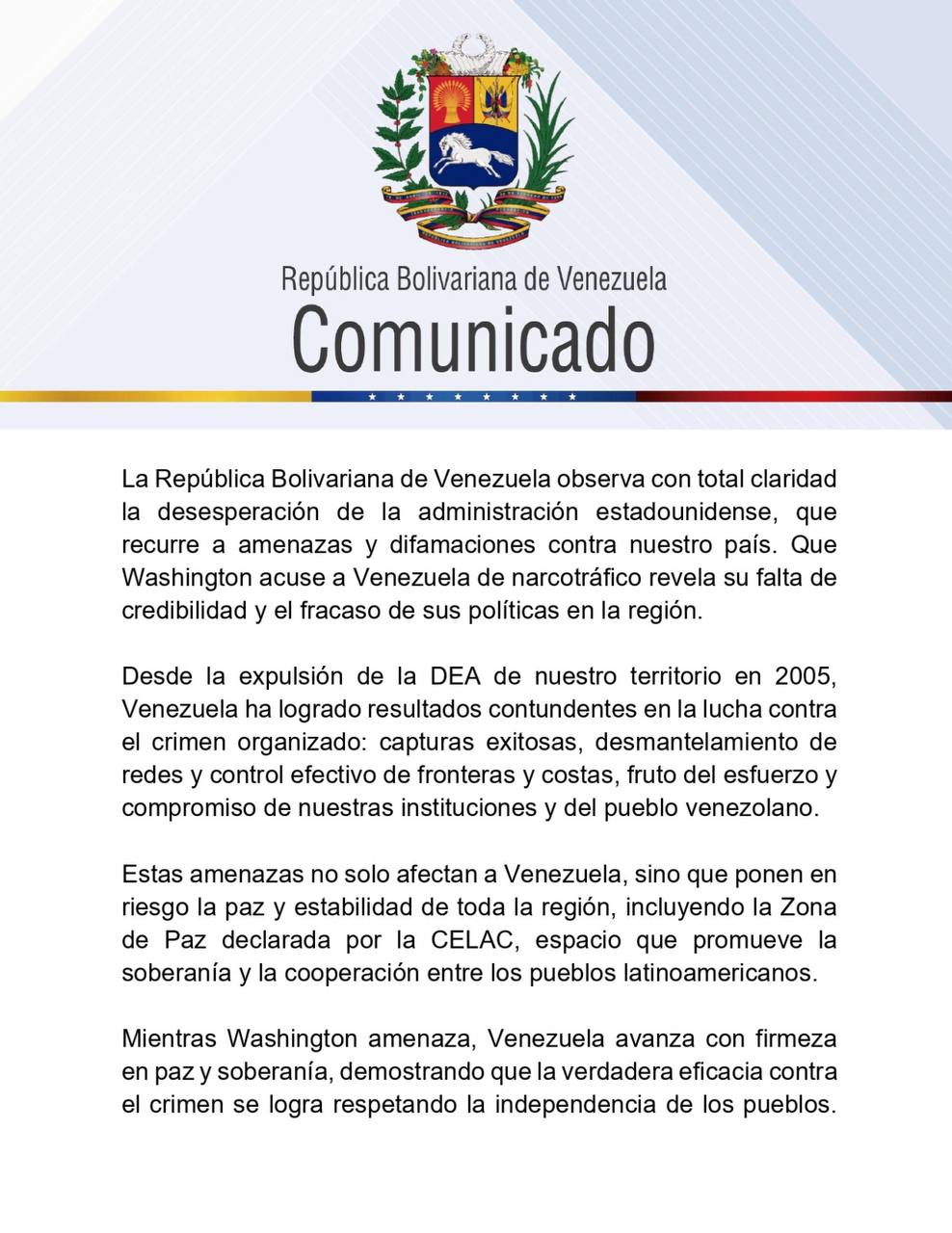 El texto califica estas afirmaciones como “amenazas y difamaciones” que reflejan “la desesperación” de Estados Unidos. «La República Bolivariana de Venezuela observa con total claridad la desesperación de la administración estadounidense, que recurre a amenazas y difamaciones contra nuestro país. Que Washington acuse a Venezuela de narcotráfico revela su falta de credibilidad y el fracaso de sus políticas en la región».