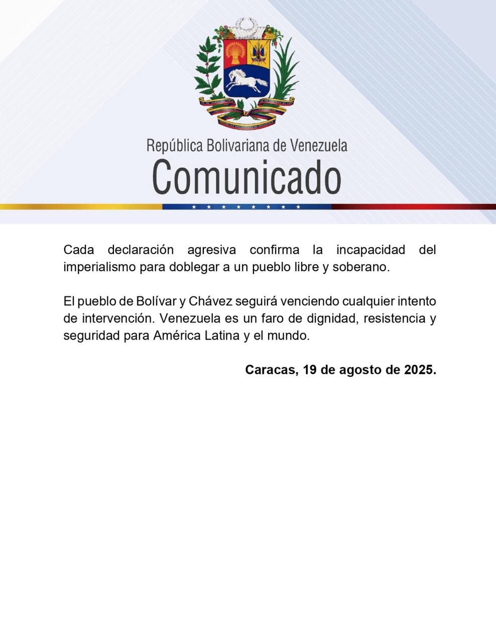 Por último, el texto reafirma la supuesta postura de resistencia del régimen, afirmando que “el pueblo de Bolívar y Chávez seguirá venciendo cualquier intento de intervención. Venezuela es un faro de dignidad, resistencia y seguridad para América Latina y el mundo”.