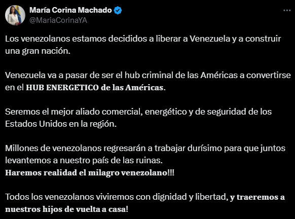 «Venezuela va a pasar de ser el hub criminal de las Américas a convertirse en el HUB ENERGÉTICO de las Américas. Seremos el mejor aliado comercial, energético y de seguridad de los Estados Unidos en la región», garantizó Machado.