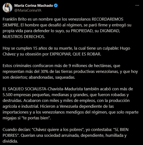 “Franklin Brito es un nombre que los venezolanos recordaremos siempre. El hombre que desafió al régimen, se paró firme y entregó su propia vida para defender lo suyo, su propiedad, su dignidad, nuestros derechos”, expresó en un mensaje compartido en su cuenta de X.