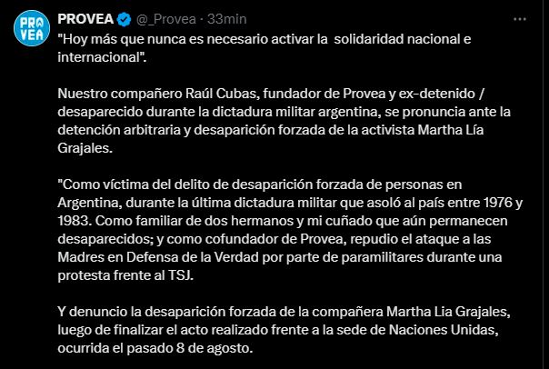 En su mensaje, Cubas repudió “el ataque a las Madres en Defensa de la Verdad por parte de paramilitares durante una protesta frente al TSJ” y denunció que la detención de Grajales ocurrió tras participar en un acto frente a la sede de Naciones Unidas el pasado 8 de agosto.