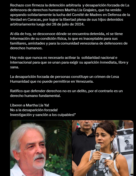 “Rechazo con firmeza la detención arbitraria y desaparición forzada de la defensora de derechos humanos Martha Lía Grajales. Al día de hoy, se desconoce dónde se encuentra detenida, ni se tiene información de su condición física, lo que es inaceptable para sus familiares, amistades y para la comunidad venezolana de defensores de derechos humanos”, declaró.