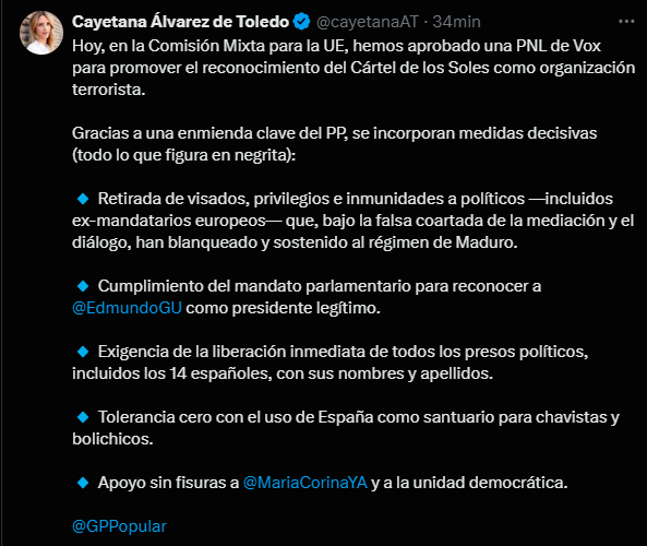 La portavoz adjunta del Grupo Parlamentario Popular en el Congreso, Cayetana Álvarez de Toledo, informó este lunes 15 de septiembre a través de su cuenta oficial en X que la Comisión Mixta para la Unión Europea aprobó una Proposición No de Ley (PNL) de Vox para instar al reconocimiento del Cártel de los Soles como organización terrorista.