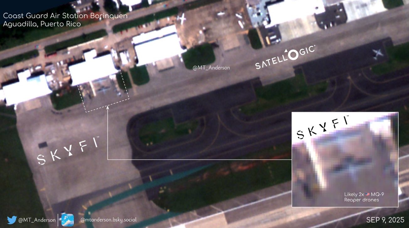 Imágenes satelitales no clasificadas revelaron el pasado martes la presencia de al menos dos drones estadounidenses MQ-9 Reaper en la Estación Aérea de la Guardia Costera Borinquen en Aguadilla, Puerto Rico.