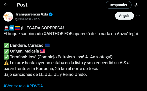 La ONG Transparencia Venezuela denunció en su cuenta oficial de X, la llegada inesperada del buque «XANTHOS EOS» al Complejo Criogénico de José Antonio Anzoátegui, uno de los principales terminales de exportación de crudo de Pdvsa.