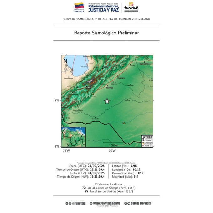 Según la información preliminar del Servicio Geológico de Colombia, el sismo tuvo una magnitud de 5.4 y su epicentro se localizó a 72 kilómetros al sureste de Socopó, en el estado Barinas.