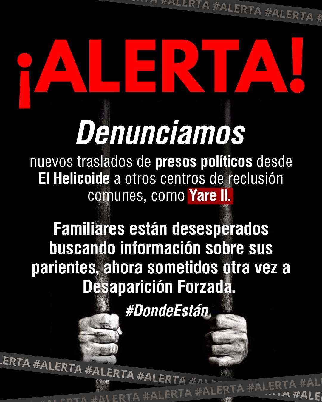 El Comité de Derechos Humanos de Vente Venezuela denunció este martes 16 de septiembre nuevos traslados de presos políticos desde El Helicoide a cárceles comunes, entre ellas el penal de Yare II, en el estado Miranda.
