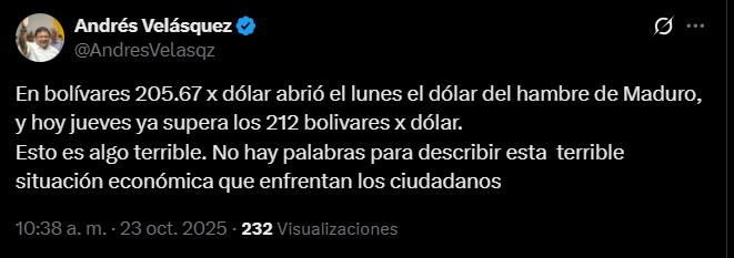 “En bolívares 205,67 x dólar abrió el lunes el dólar del hambre de Maduro, y hoy jueves ya supera los 212 bolívares x dólar. Esto es algo terrible. No hay palabras para describir esta terrible situación económica que enfrentan los ciudadanos”, denunció en su cuenta de X (antes Twitter).