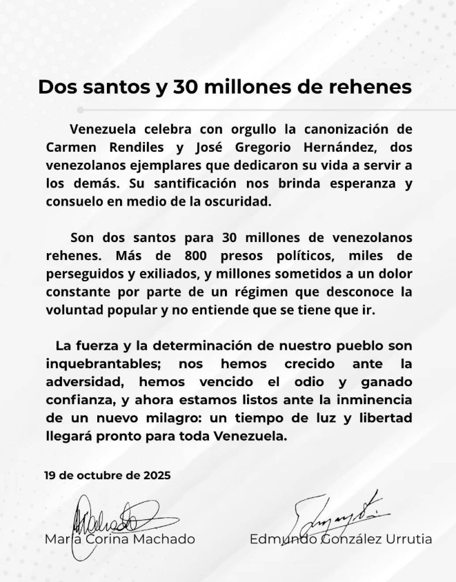 Venezuela celebra con orgullo la canonización de Carmen Rendiles y José Gregorio Hernández, dos venezolanos ejemplares que dedicaron su vida a servir a los demás. Su santificación nos brinda esperanza y consuelo en medio de la oscuridad.