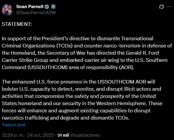 «En apoyo a la directiva del presidente de desmantelar las Organizaciones Criminales Transnacionales (TCOs) y contrarrestar el narcoterrorismo en defensa de la Patria, el secretario de Guerra ha enviado al Grupo de Ataque de Portaaviones Gerald R. Ford y al ala aérea embarcada del portaaviones al área de responsabilidad (AOR) del Comando Sur de los Estados Unidos (USSOUTHCOM)», indicó el texto publicado en redes sociales por Sean Parnell, portavoz del Pentágono.