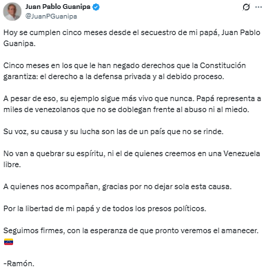 El hijo del dirigente político subrayó que el ejemplo de su padre se mantiene vigente, afirmando que Juan Pablo Guanipa «representa a miles de venezolanos que no se doblegan frente al abuso ni al miedo.»