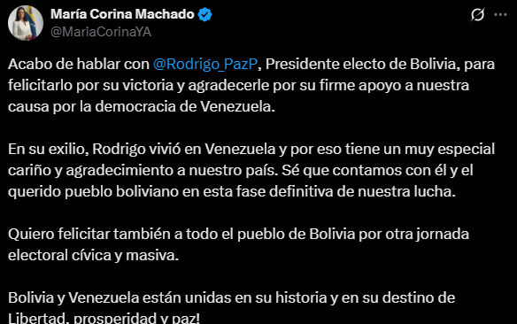 Según el mensaje de la líder de la oposición democrática en su cuenta de X, la conversación sirvió para establecer contacto directo y reafirmar el apoyo del líder boliviano a la situación política venezolana.