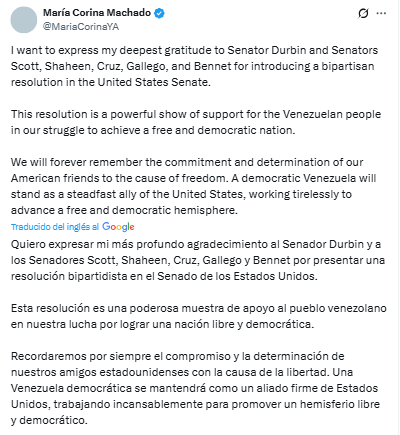 «Quiero expresar mi más profundo agradecimiento al Senador Durbin y a los Senadores Scott, Shaheen, Cruz, Gallego y Bennet por presentar una resolución bipartidista en el Senado de los Estados Unidos», escribió Machado en X.