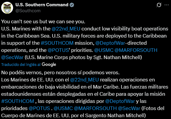 «No podéis vernos, pero nosotros sí podemos veros. La 22° Unidad Expedicionaria de los Marines de EEUU realizan operaciones en embarcaciones de baja visibilidad en el mar Caribe», informó la cuenta del Comando Sur en redes sociales.