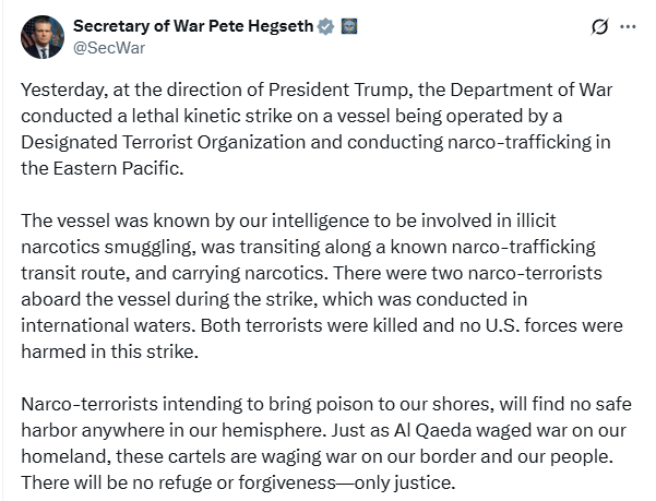 Junto a la publicación, Hegseth informó que el ataque se llevó a cabo el martes «bajo la dirección del presidente Trump» y resultó en la muerte de dos «narcoterroristas» que iban a bordo.