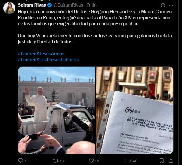La activista venezolana Sairam Rivas informó a través de su cuenta oficial en X (antes Twitter), que entregó una carta al papa León XIV durante la ceremonia de canonización del Dr. José Gregorio Hernández y la Madre Carmen Rendiles en Roma.