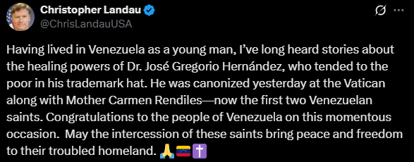 Landau emitió la declaración a través de su cuenta en la red social X este lunes 20 de octubre, un día después de las canonizaciones en el Vaticano. en el mensaje, el funcionario estadounidense evocó su experiencia personal con el país. «Habiendo vivido en Venezuela cuando era joven, he escuchado durante mucho tiempo historias sobre los poderes curativos del Dr. José Gregorio Hernández, quien atendía a los pobres con su característico sombrero».