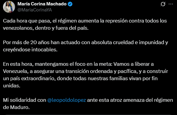 La dirigente concluyó su publicación reiterando su respaldo a López. «Mi solidaridad con @leopoldolopez ante esta atroz amenaza del régimen de Maduro», puntualizó.