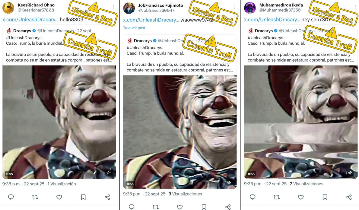 Uno de ellos, conformado por al menos 80 cuentas similares a bot —probablemente automatizadas—, hizo citas masivas a una publicación de Dracarys contra Donald Trump con un video de propaganda titulado “Caso: Trump, la burla mundial”. Todas interactuaron con la publicación exactamente a las 9:35 p. m., añadiendo códigos aleatorios sin sentido al texto, una señal de posible presencia de cuentas bots (automatizadas).