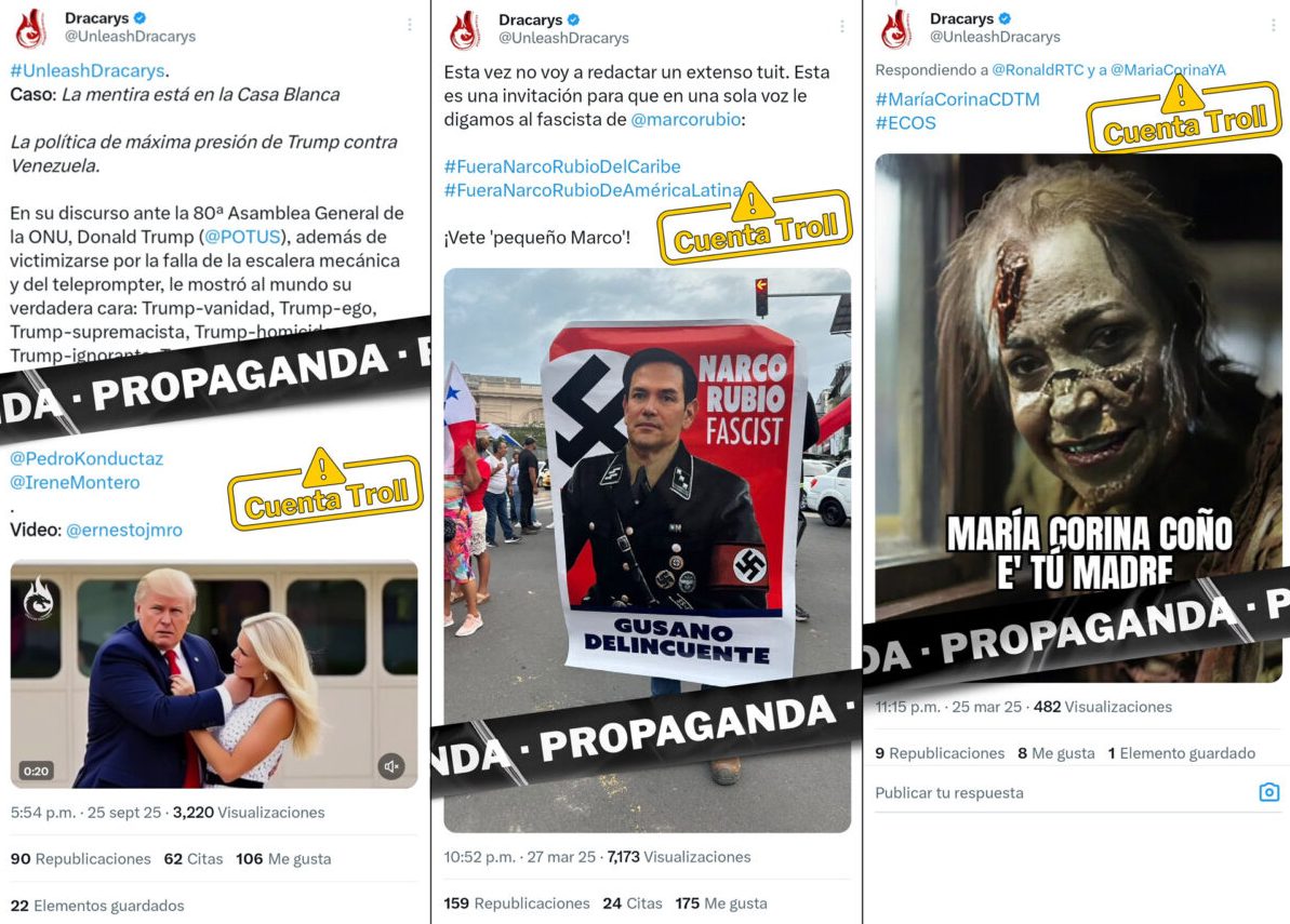 En sus publicaciones, Dracarys recurre a un tono altamente emocional y descalificador, con piezas audiovisuales que incorporan elementos generados o manipulados con IA y que, a veces, deshumanizan a adversarios del gobierno de Maduro. Su comunidad replica estas dinámicas: participa en etiquetas, y difunde textos, memes e imágenes con el logo del dragón y la etiqueta #UnleashDracarys.