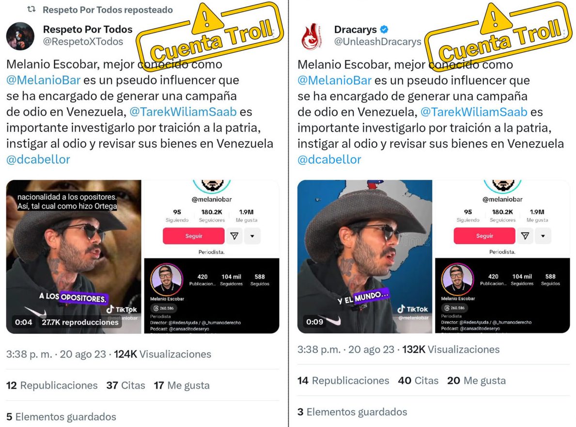 En agosto de 2023, el periodista venezolano en el exilio Melanio Escobar, denunció que un perfil anónimo en X llamado @RespetoXTodos había intentado criminalizar su trabajo asegurando que estaba detrás de “una campaña de odio” y etiquetando en sus acusaciones al fiscal general de Venezuela, Tarek William Saab. Escobar no fue el único usuario de X que recibió amenazas de la cuenta troll, cuya identidad se desconocía hasta entonces.