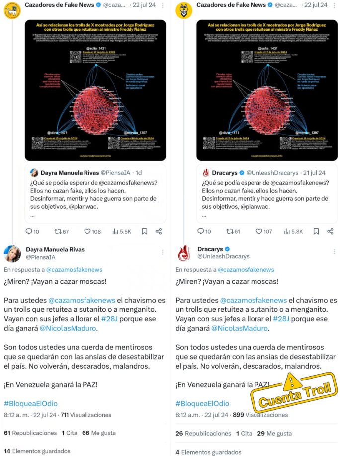 El 19 de julio de 2024, Jorge Rodríguez —presidente de la Asamblea Nacional, jefe de campaña de Nicolás Maduro y exministro de Comunicación— presentó en rueda de prensa varias capturas de mensajes de odio publicados en X, atribuyéndolos a supuestos opositores. Posteriormente se demostró que provenían de una operación de desinformación de falsa bandera, ejecutada por una red de cuentas trolls que estaba vinculada con la campaña de Maduro.