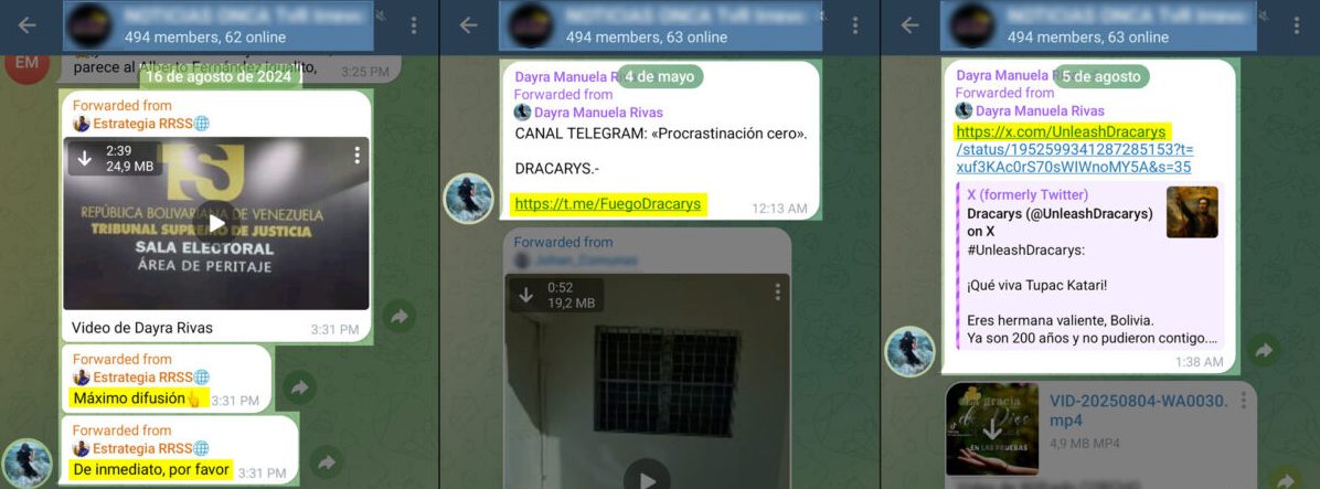 El 16 de agosto de 2024, en un grupo público de Telegram donde se organizan decenas de integrantes de varios colectivos digitales y de la “guerrilla comunicacional” oficialista, Dayra Rivas compartió un contenido con una clara instrucción: “Máxima difusión. De inmediato, por favor”, adjuntando un video sobre el supuesto “peritaje técnico” de actas que el oficialismo presentaba como prueba definitiva de la victoria de Nicolás Maduro en las presidenciales del 28 de julio.