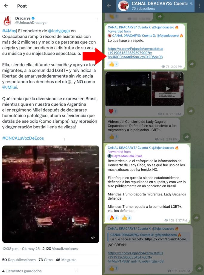 A través del canal, en mayo de 2025, Rivas impartió instrucciones sobre cómo se debía responder a una publicación de Dracarys en X, que en ese momento tenía otro nombre de usuario distinto, @FojandoAcero (sic.), sobre un concierto de la cantante Lady Gaga en Río de Janeiro.