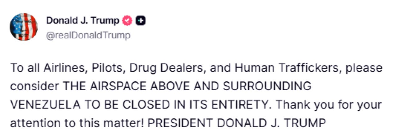 «A todas las aerolíneas, pilotos, narcotraficantes y traficantes de personas: les rogamos que consideren que el espacio aéreo sobre Venezuela y sus alrededores permanecerá cerrado en su totalidad. ¡Gracias por su atención! PRESIDENTE DONALD J. TRUMP», reza el mensaje del mandatario, que no aclara ninguna circunstancia relacionada con el cierre, en un momento de alta tensión entre los dos países.