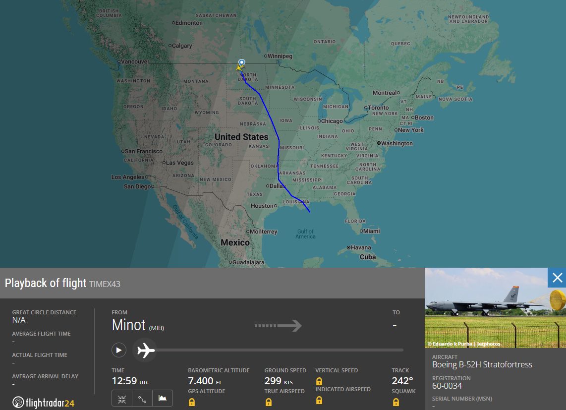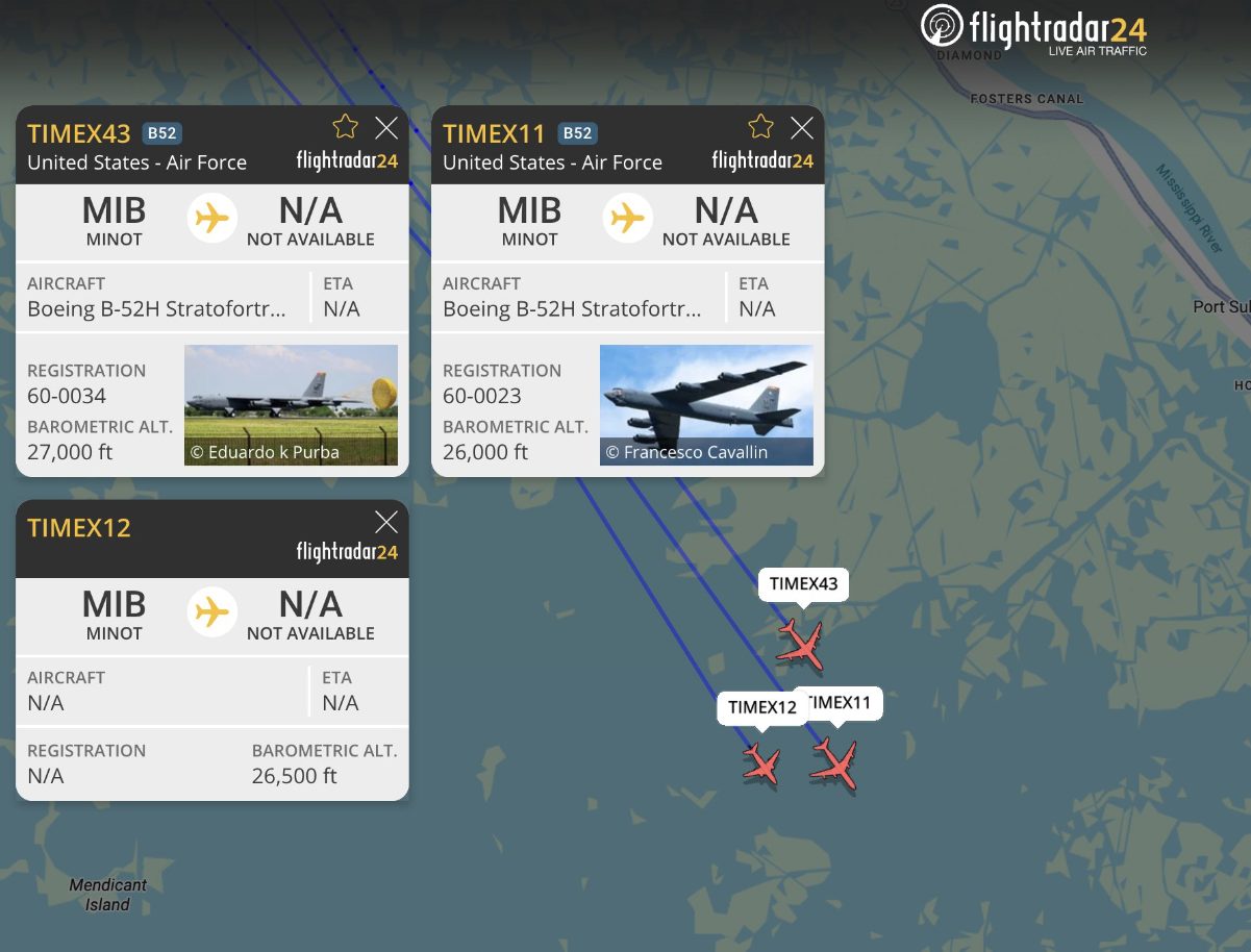 De acuerdo con el registro del monitor digital FlightRadar24, al menos tres aviones (dos B-52 y una tercera aeronave no identificada) abandonaron el territorio continental de EEUU con dirección sureste tras despegar más temprano desde la Base de la Fuerza Aérea en Minot, Dakota del Norte.