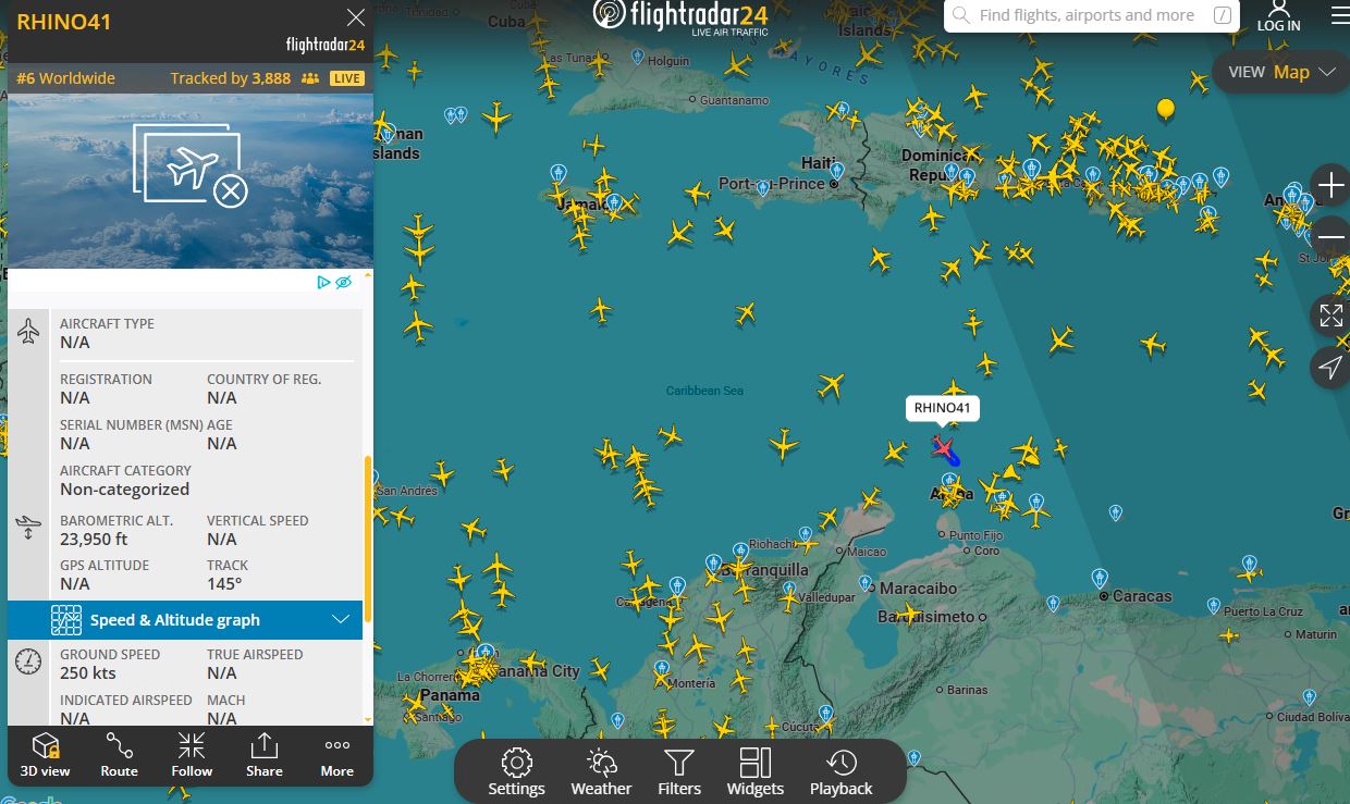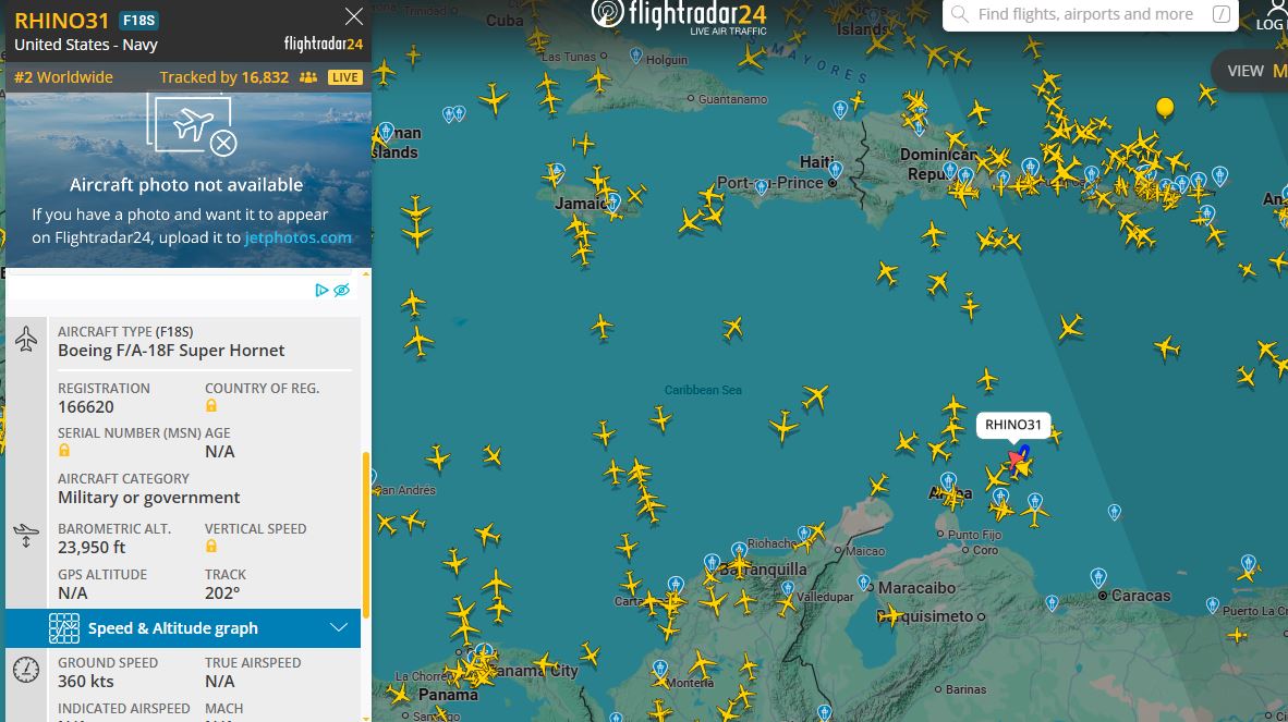 Al menos dos F/A-18E/F Super Hornets con callsigns RHINO11 (registro 166664) y RHINO12 (registro 168890) fueron detectados la tarde del martes 25 de noviembre, volando a altitudes de entre 22.000 y 24.000 pies, a velocidades de hasta 360 nudos, en aguas internacionales al norte de Venezuela, según datos de seguimiento de vuelo en tiempo real.