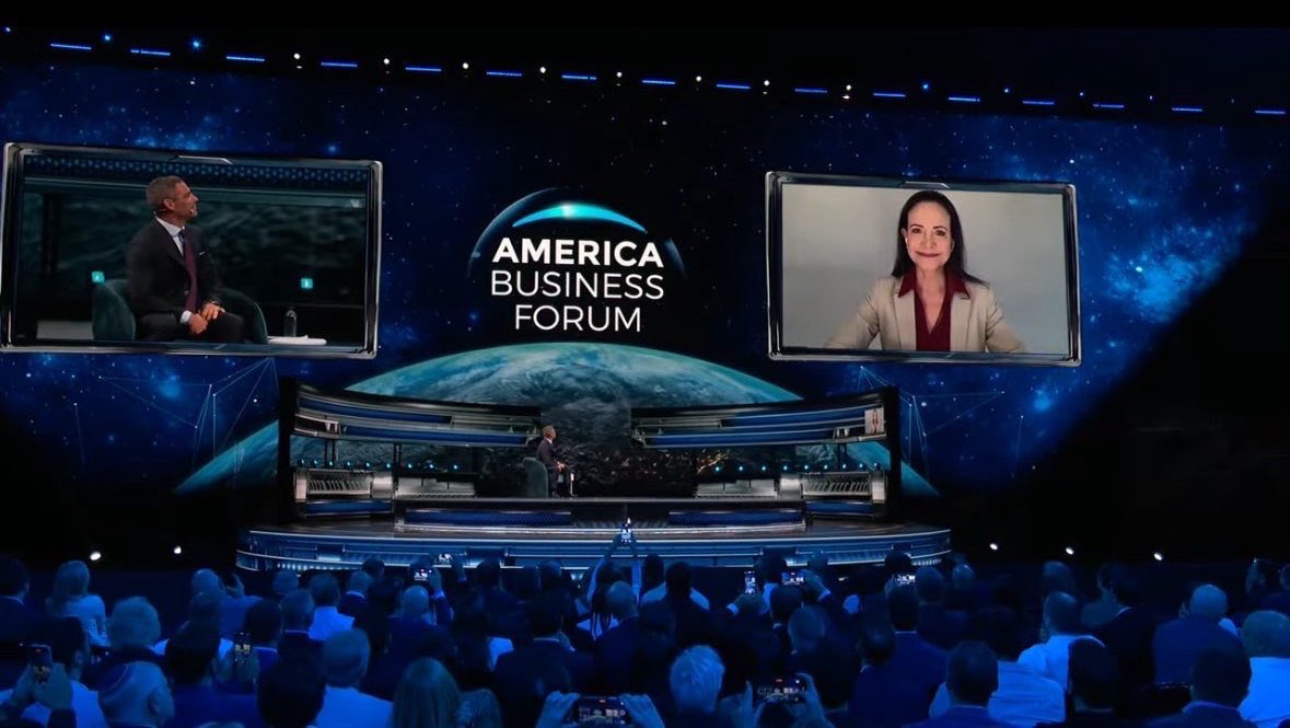 La líder opositora venezolana y Premio Nobel de la Paz, María Corina Machado, afirmó este martes en una videoconferencia en Miami que si se libera Venezuela, se liberan también Cuba y Nicaragua, durante su participación en el America Business Forum, un encuentro de líderes empresariales y políticos.