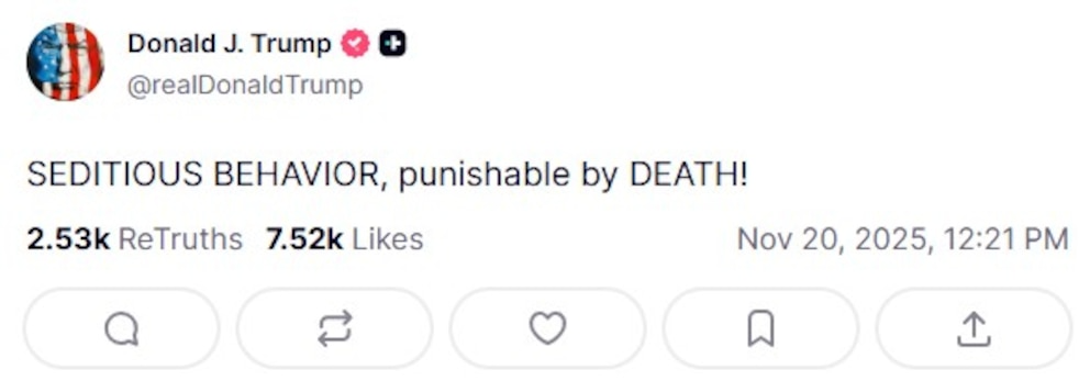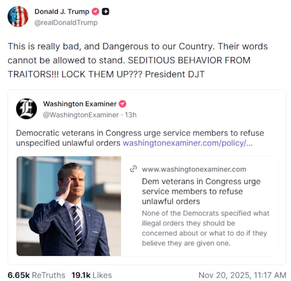 Los comentarios del mandatario republicano llegaron después de que republicara un artículo sobre un video difundido el martes por seis legisladores demócratas que sirvieron en las fuerzas armadas o en la comunidad de inteligencia. En el mensaje, los congresistas recordaban a los miembros del ejército su deber de rechazar órdenes ilegales.