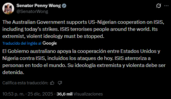 El Gobierno de Australia expresó este viernes su apoyo a Estados Unidos por el ataque aéreo lanzado contra objetivos del grupo terrorista Estado Islámico (EI) en el noroeste de Nigeria, en coordinación con las tropas de este país.