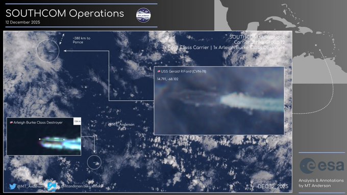 Los registros captados por el satélite Sentinel 2 de la Agencia Espacial Europea (ESA) situaron al navío nuclear aproximadamente a 380 millas al sur-suroeste de la ciudad de Ponce. El analista de inteligencia de fuentes abiertas (OSINT) identificado como @MT_Anderson reportó el hallazgo y destacó que esta es la ubicación más austral rastreada desde la llegada del portaaviones al teatro de operaciones.