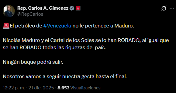 El legislador norteamericano aseguró que «Nicolás Maduro y el Cartel de los Soles se lo han ROBADO, al igual que se han ROBADO todas las riquezas del país. Ningún buque podrá salir. Nosotros vamos a seguir nuestra gesta hasta el final».