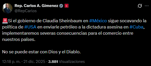 El congresista republicano Carlos Giménez alertó este domingo a la presidenta mexicana, Claudia Sheinbaum, que recibirá eventuales consecuencias si mantiene el envío de petróleo a Cuba.