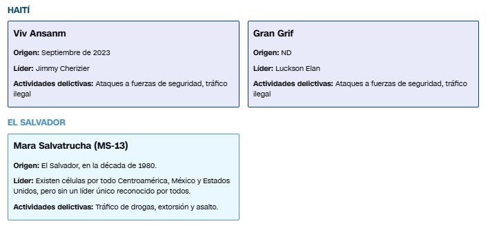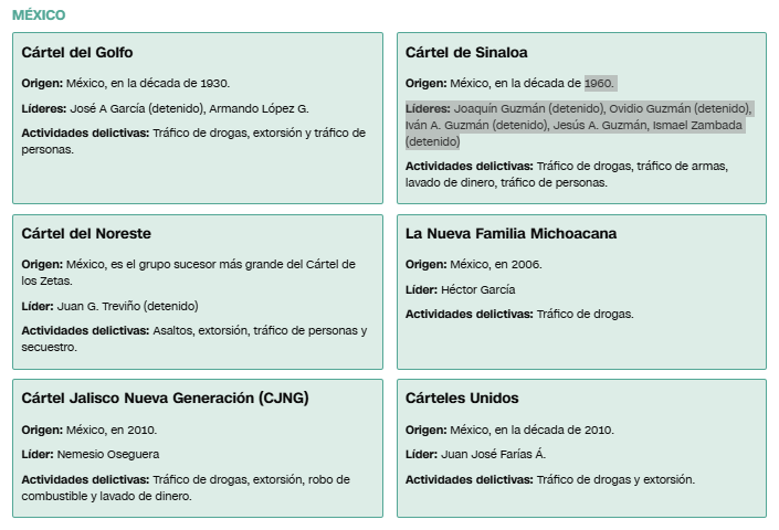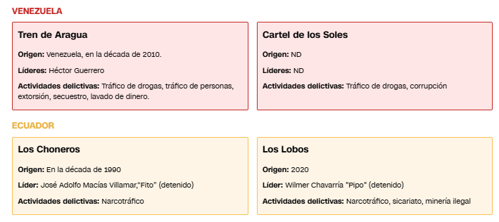 Fuente: Informe del Servicio de Investigación del Congreso (CRS), DEA, El Departamento de Estado de EE.UU., Insight Crime., Oficina de Control de Activos Extranjeros (OFAC) del Departamento del Tesoro de EE.UU.