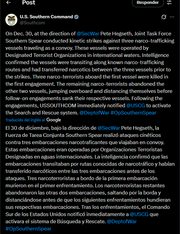 De acuerdo con un comunicado publicado en la cuenta oficial del Comando Sur en la red social X, la operación fue ejecutada el pasado 30 de diciembre por la Fuerza de Tarea Conjunta «Lanza del Sur», bajo la dirección del secretario de Guerra, Pete Hegseth.
