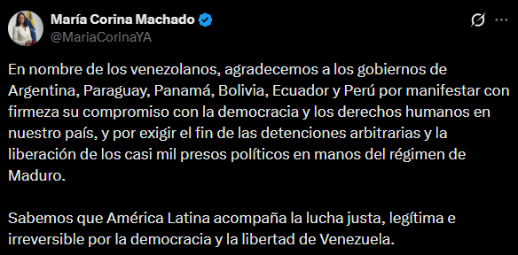 «En nombre de los venezolanos, agradecemos a los gobiernos de Argentina, Paraguay, Panamá, Bolivia, Ecuador y Perú por manifestar con firmeza su compromiso con la democracia y los derechos humanos en nuestro país, y por exigir el fin de las detenciones arbitrarias y la liberación de los casi mil presos políticos en manos del régimen de Maduro», celebró Machado en sus redes sociales.