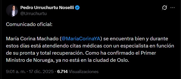 A través de un comunicado publicado en su cuenta de X, Urruchurtu precisó que Machado está enfocada en su pronta y total recuperación, y confirmó además que ya no se encuentra en la ciudad de Oslo, tal como lo ratificó previamente el primer ministro de Noruega.