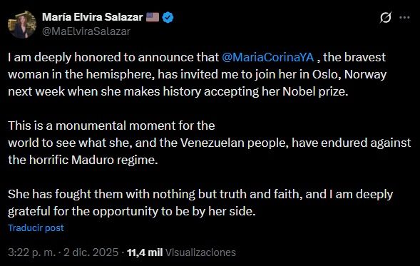 La congresista republicana por Florida, María Elvira Salazar, anunció este martes 2 de diciembre que asistirá a la ceremonia de entrega del Premio Nobel de la Paz en Oslo, Noruega, tras recibir una invitación personal de la líder de la oposición democrática María Corina Machado.