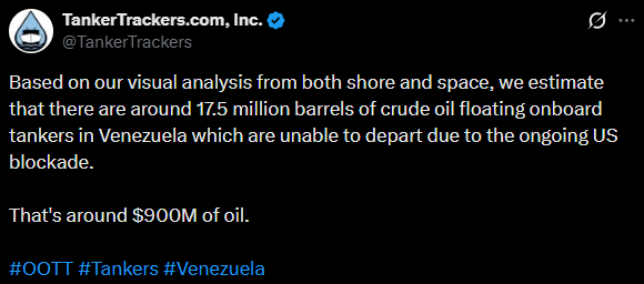 «Con base en nuestro análisis visual tanto desde la costa como desde el espacio, estimamos que hay alrededor de 17,5 millones de barriles de petróleo crudo flotando a bordo de buques tanque en Venezuela que no pueden partir debido al actual bloqueo estadounidense», comentó TankerTrackers en redes sociales.