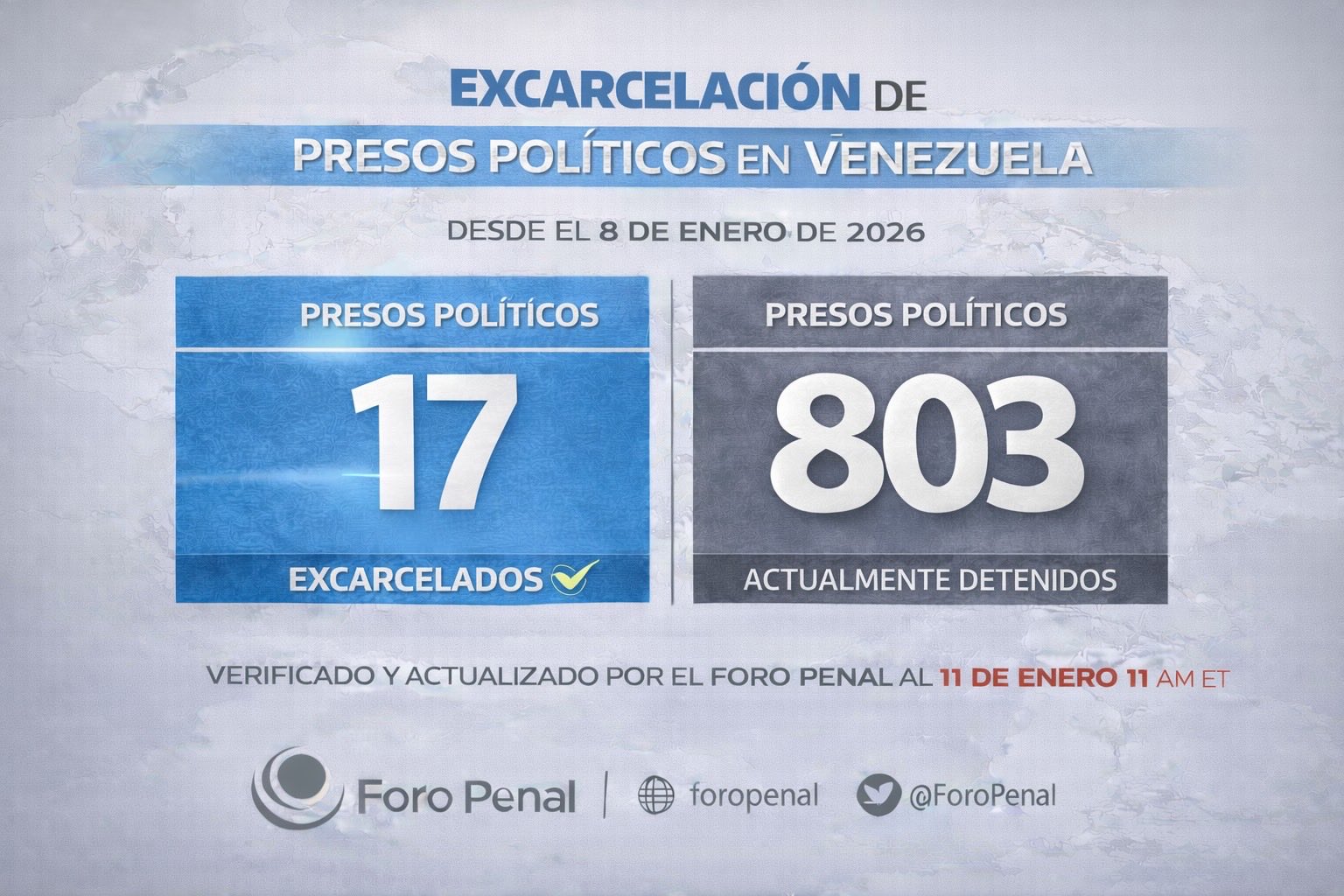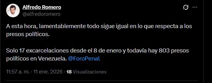 Pese a esta nueva liberación, el balance general sigue siendo desalentador. El presidente de Foro Penal, Alfredo Romero, advirtió que, hasta el cierre de la jornada, “lamentablemente todo sigue igual en lo que respecta a los presos políticos”.
