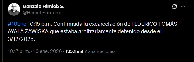 A las 10:15 p.m., Himiob informó sobre la excarcelación de Federico Tomás Ayala Zawiska, quien se encontraba arbitrariamente detenido desde el 3 de diciembre de 2025, convirtiéndose en el caso número 17 confirmado por la organización de derechos humanos desde el pasado 8 de enero.