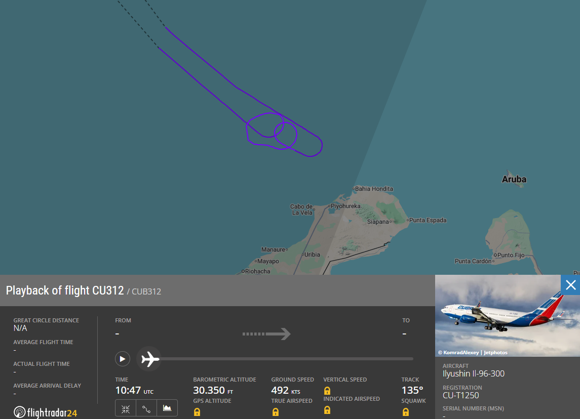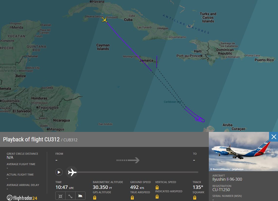 Según datos del monitor digital FlightRadar24, la aeronave de fabricación rusa, modelo Ilyushin Il-96-300, usada alternativamente para vuelos comerciales y viajes presidenciales de Miguel Díaz-Canel, realizó un par de giros de 360 grados cerca de Venezuela antes de desistir por completo de llegar a su destino inicial.