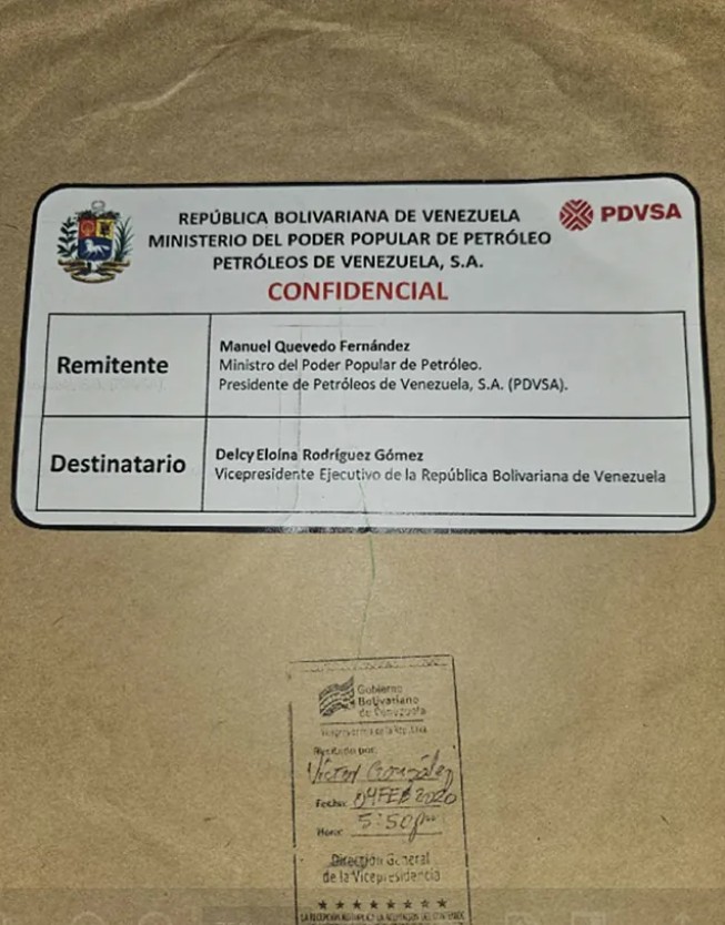 El encabezamiento del sobre indica que corresponde a la República Bolivariana de Venezuela. Ministerio del poder Popular del Petróleo. Petróleos de Venezuela SA» y que es «Confidencial». El remitente es el ministro Manuel Quevedo Fernández y el destinatario, la vicepresidenta. De ella habría pasado a Víctor de Aldama.